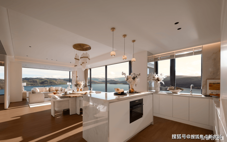 为了让景观与光线最大化进入室内,全景舱户型搭配0.6黄金窗墙比(远超常规住宅 0.3-0.5 的标准)——大面积玻璃幕墙取代传统墙体,不仅让建筑外立面呈现出 “水晶盒子” 般的轻盈质感,更让室内空间实现 “全明通透”:客厅无需依赖灯光,白天也能保持明亮;卧室即使在阴雨天,也能透过玻璃引入柔和的自然光线;就连厨房、卫生间等区域,也通过小尺寸玻璃窗设计,避免“暗厨暗卫” 的压抑。