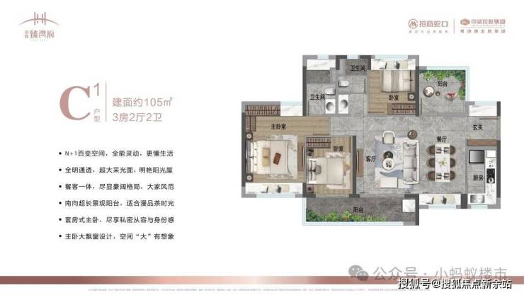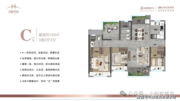 105㎡3+1房:南北双阳台设计,南向6米景观阳台,主卧套房带独立衣帽间,改善升级首选。
