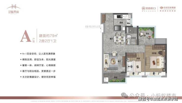 79㎡2+1房:3开间朝南,主卧带飘窗,N+1空间可改造为书房或儿童房,适合年轻家庭。