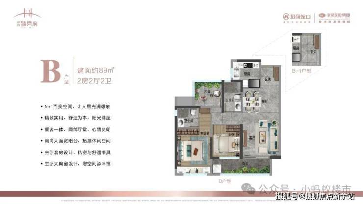 灵活户型设计:79㎡2+1房、89㎡2+1房,105㎡3+1房、119㎡4房,满足单身、三口之家到三代同堂的全生命周期需求。