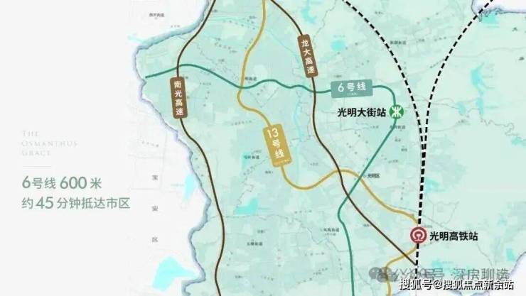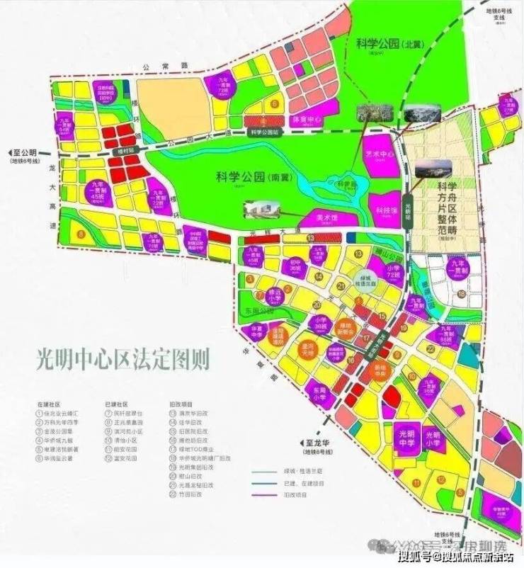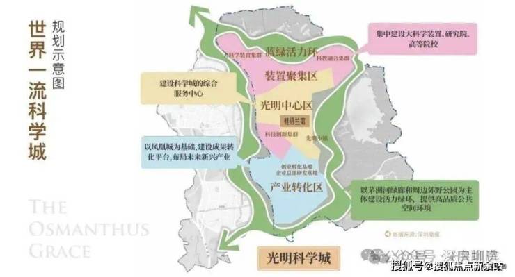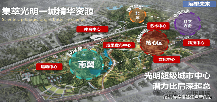 光明布局规划“一心两区”,“一心”即光明中心区,建设科学城的生活服务中心,集聚商业、居住、大型公共服务设施等顶级配套。