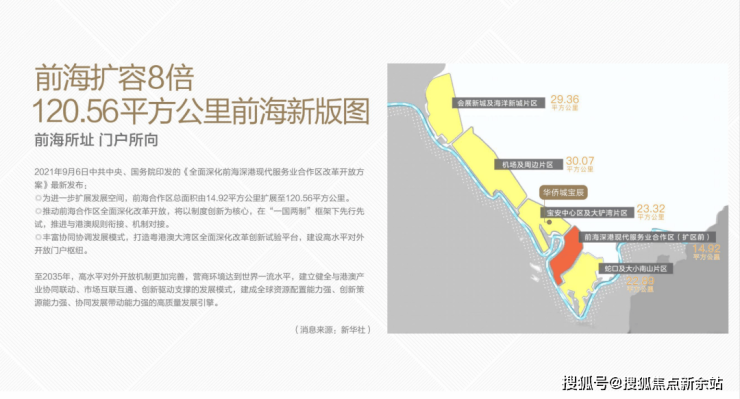 自2021年9月6号,中共中央、国务院正式官宣前海深港合作区扩容,总面积由14.92平方公里扩展至120.56平方公里,纳蛇口、宝安国际机场及大空港区于前海深港合作区
