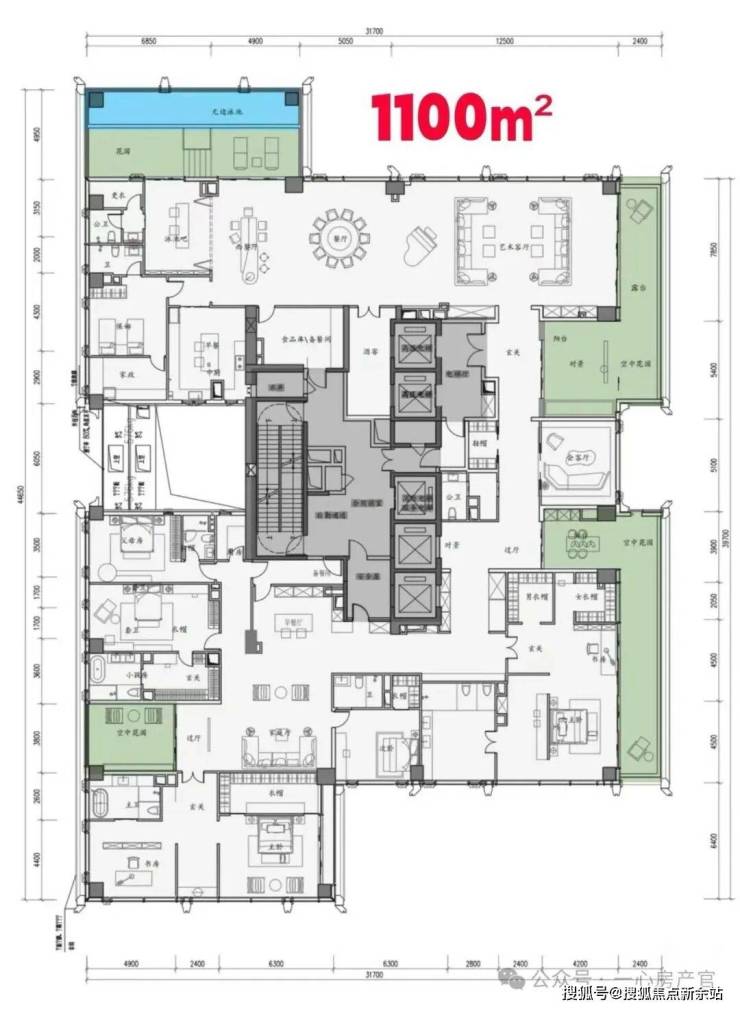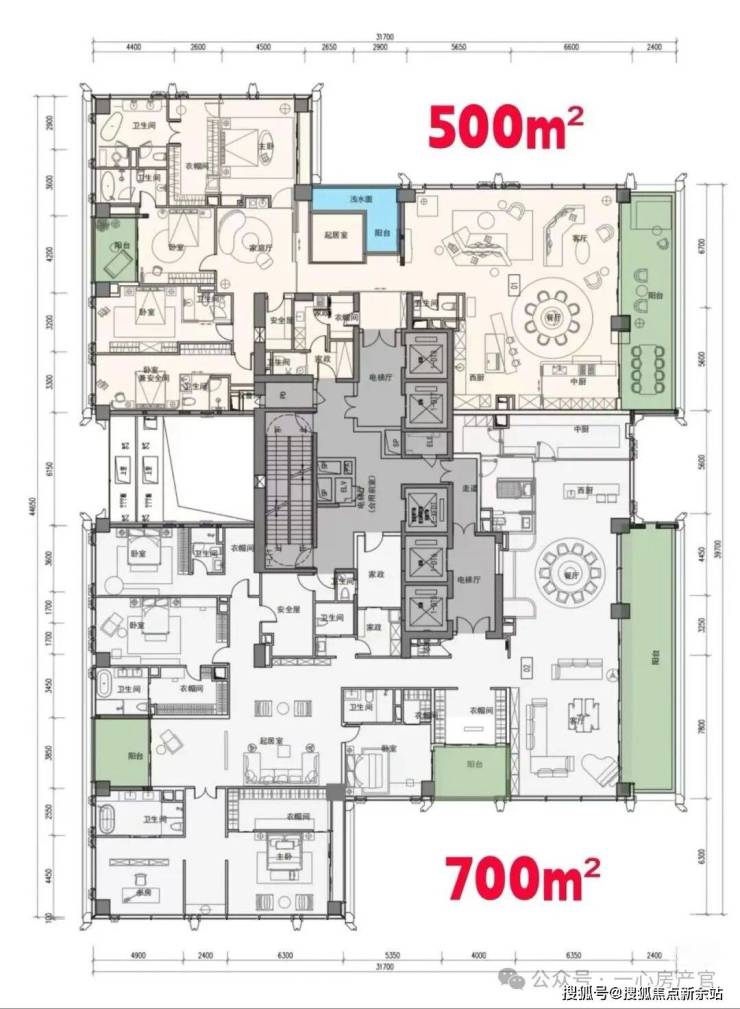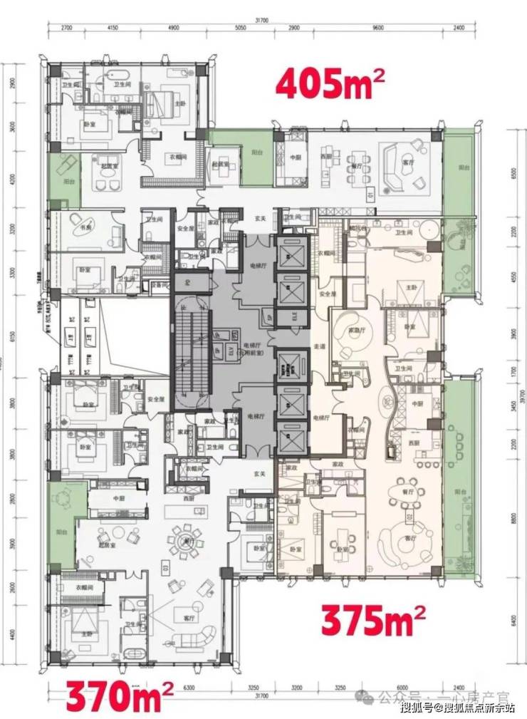 高区41F起(150-200米),每层是5梯3户,都是专梯入户空间,户型是约370-375-403㎡的4+1房五卫+家庭厅+家政套间
