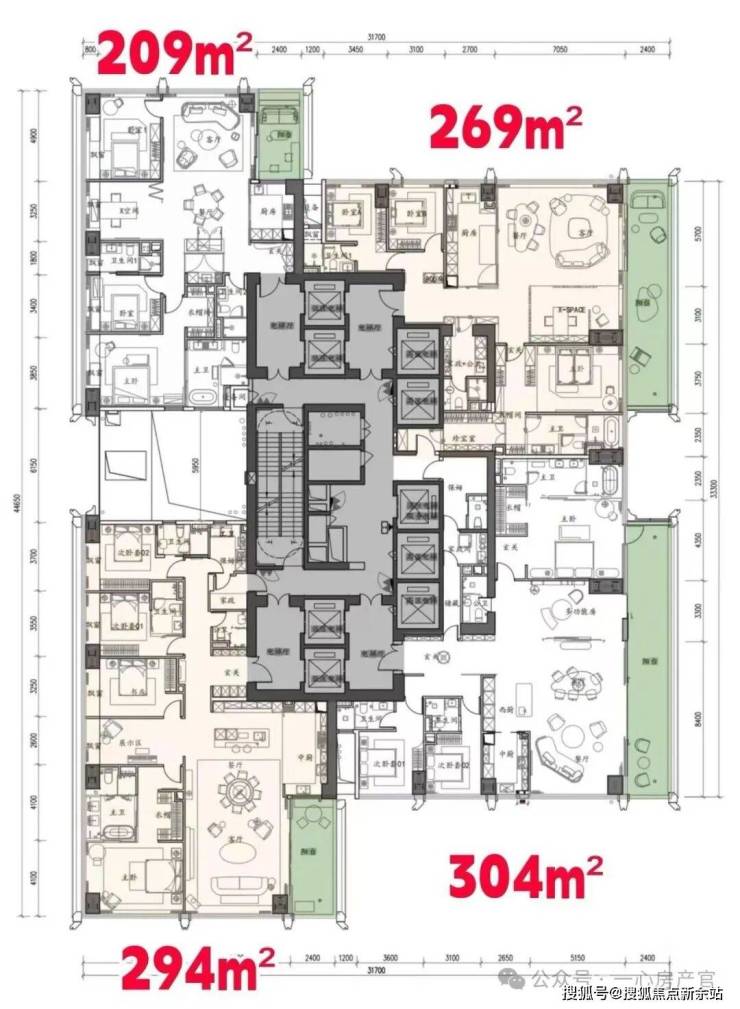 户型是约209-304㎡四房大户型(209㎡四房三卫+家政、269㎡四房三卫+家政套间、294-304㎡四房四卫+家政套间)