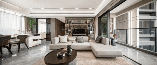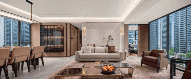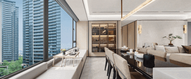 若是将客厅与相邻卧室打通做三房格局,可拥有超6.7米的大横厅,整个会客厅可以达到超76㎡的奢阔尺度,对标市面上170㎡+大平层的客厅;