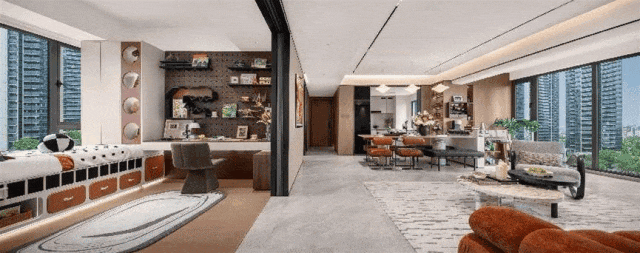 或者将主卧与次卧打通,改造为独立书房、健身房等使用,形成一个集洗漱、办公、妆造、睡眠等多功能为一体的酒店总统套房级私享空间;主卧L型飘窗的270°采光和视野,让空间更添一份自然的意趣。