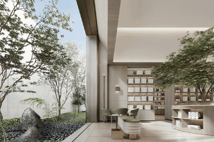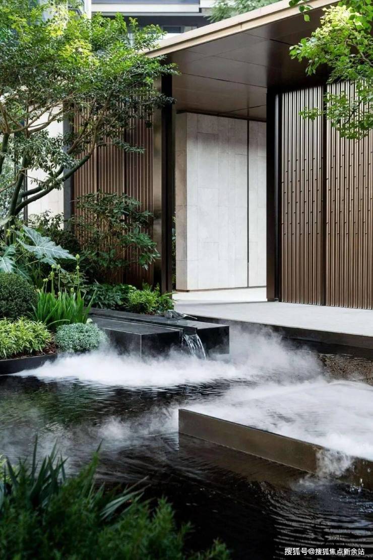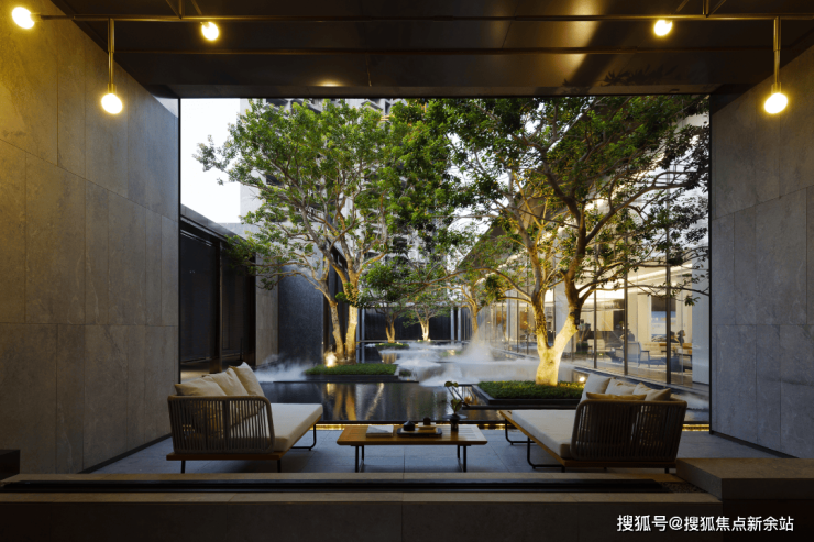 进入社区,由风雨连廊串联起的园林,以简雅东方、诗意自然为美学基调,将松山湖美景融入庭院。