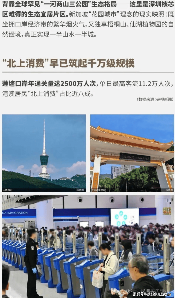 这一独特地理位置赋予项目两大核心优势:一是生态资源丰富,背靠梧桐山麓,周边环绕仙湖植物园等67个公园,3km范围内负氧离子浓度全市前列,为居民提供天然氧吧般的居住环境;二是跨境便利性突出,通过莲塘口岸可快速通达香港,口岸开通后客流量持续攀升,2024年出入境人员突破2000万人次,是深港"东进东出"战略的重要枢纽。项目所在区域被官方定位为"深港深度融合发展的试验区、先行区",未来随着深港合作深化,这一区位价值将进一步凸显。