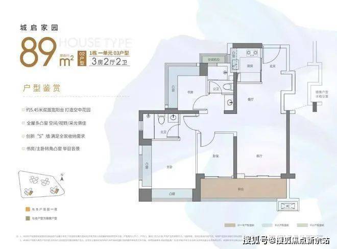 89㎡的3房2厅2卫,02.03户型,设计的是经典竖厅格局,客厅3.4米开间,LDKB一体化,S墙设计预留冰箱卡槽位,动静分区,三开间朝南,3个卧室分别做到了主卧13.79㎡/次卧7.62㎡/次卧6.93㎡(包含墙体飘窗),主卧+1个次卧270°飘窗设计,U型厨房,公卫三段式分离,客厅连接卧室出5.75米长的大阳台,得房率约87.2%(包含赠送),东南朝向。