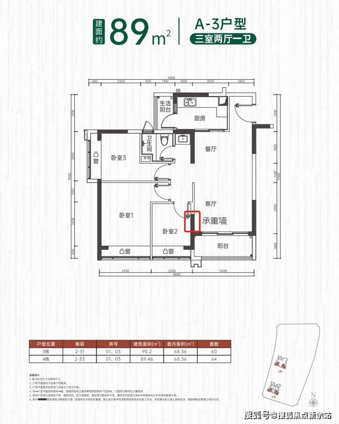 两房户型基本都没有硬伤,除了卫生间小一点以外,卧室空间和朝向都比较舒适。从户型排序上看 A-1>A-2'>A-2。从景观视野来看,4#栋优于3#栋。