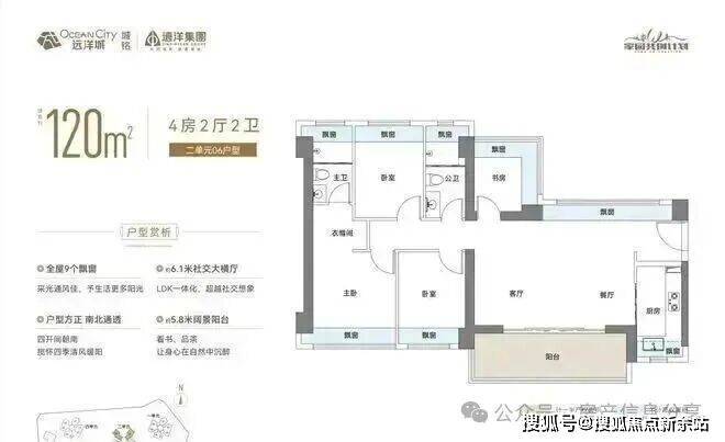 120㎡的4房2厅2卫,设计的是横厅南北通透格局,进门独立玄关,客餐厅6.1米开间,LDKB一体化,四开间朝南,主卧双飘窗通透设计,全屋9面凸窗,L型厨房,卫生间干湿分离,得房率约76.2%(不含赠送),客餐厅出5.8米长的阳台主朝西南或东南向。