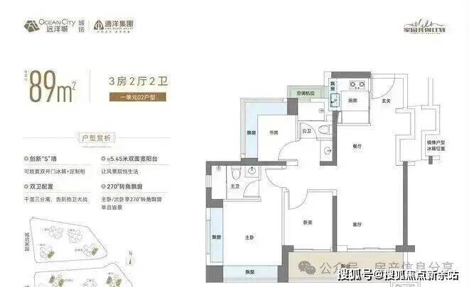 89㎡的3房2厅2卫,设计的是经典竖厅格局,客厅3.154米开间,客餐厅约18.8㎡,LDKB一体化,S墙设计预留冰箱卡槽位,动静分区,分别做到了主卧13.66㎡/次卧7.04㎡/次卧6.28㎡(实测面积,去掉墙体),主卧+1个次卧270°飘窗设计,U型厨房,公卫三段式分离,客厅连接卧室出7.56平的大阳台,得房率约76.2%(不含赠送),东南、西南或西北朝向。
