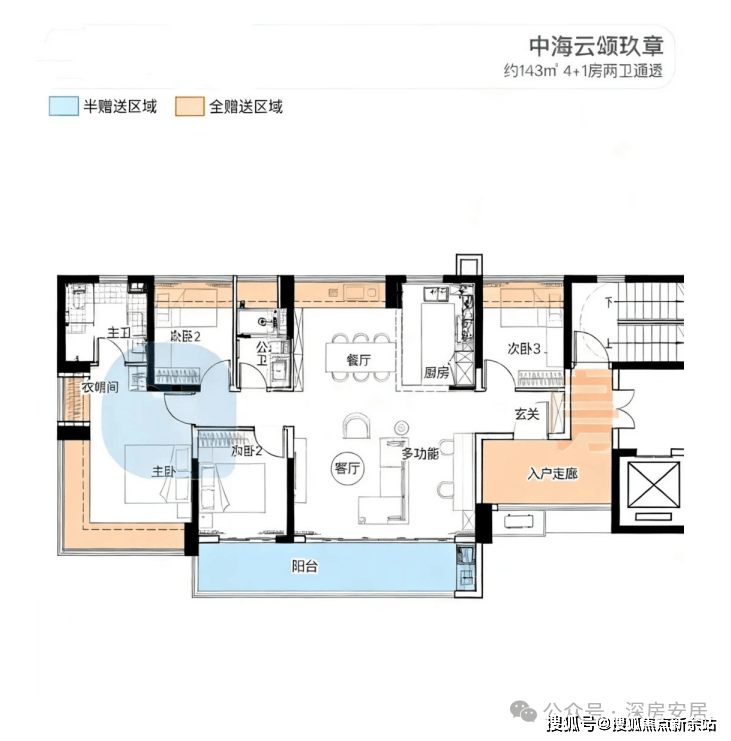 143㎡的4房2厅2卫,设计的是横厅南北通透格局,进门独立入户走廊全赠送,客餐厅分离化设计,横厅大客厅+功能间,五开间朝南,主卧270°无柱转角飘窗+1个次卧朝南,2个次卧朝北向,U型厨房,卫生间干湿分离,得房率约:100%(包含赠送),西南或正南朝向。