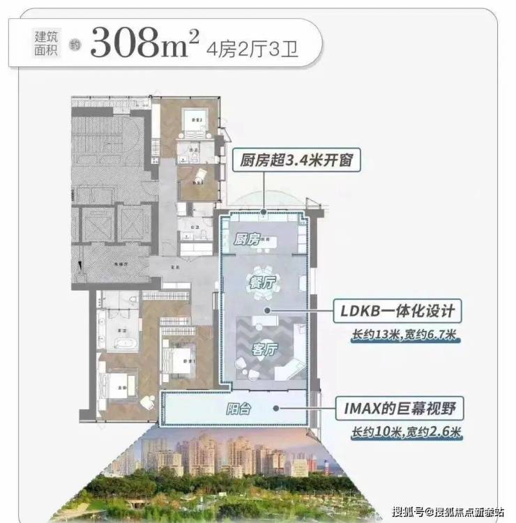 转角阳台设计,使客厅实现270°IMAX景观视野,可享多重景观视野。楼下绿意盎然的中心公园、未来附近林立的CBD高楼、远处的城市和山脉风光……一览无余。