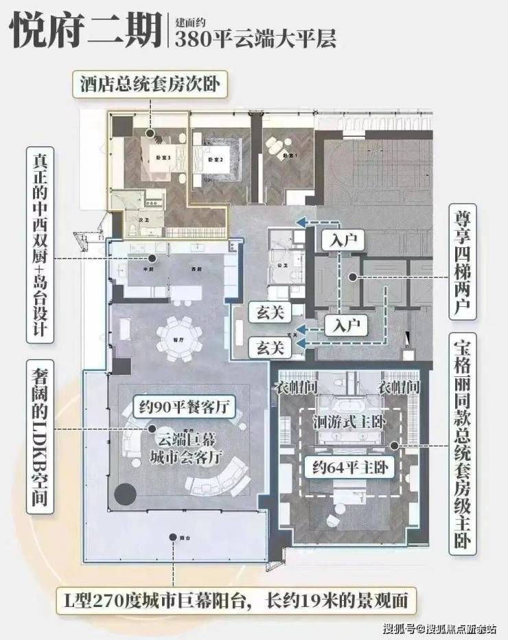CBD悦府二期再次颠覆了东莞人对豪宅的想象。包含两种户型,建面约308㎡和380㎡