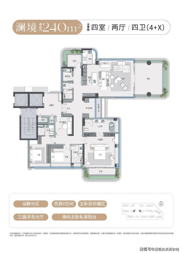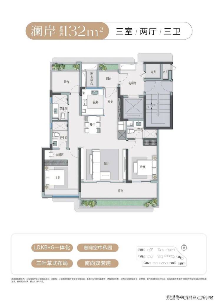 作为项目核心价值亮点,三亚首发的“建面约132-240㎡浮岛全景舱”设计,重新定义了滨海旅居空间标准。依托约2.0低容积率、40%高绿地率的低密社区规划,大部分产品采用LDKB+G一体化、宽幕奢景阳台、多开间朝南等创新设计,部分户型配备270°飘窗、中西双厨及灵动X空间,最大化引入自然光线与景观资源,实现“推窗见绿、凭栏观景”的居住体验,精准适配多代同堂旅居、长期度假栖居等多元需求。