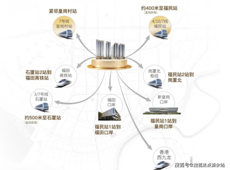 福田CBD中轴线,毗邻皇岗口岸,10分钟直达香港北区,30分钟覆盖香港中环、尖沙咀等核心商圈,完美适配香港上班族的跨境通勤需求。