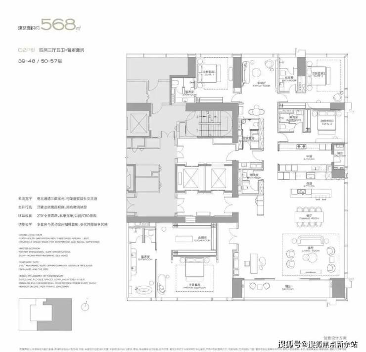 南北通透三面采光,顶奢总统套房规格,270°全景套房,享受湿地/公园/CBD景观,都是套房设计,更具私密性,中西厨分离。