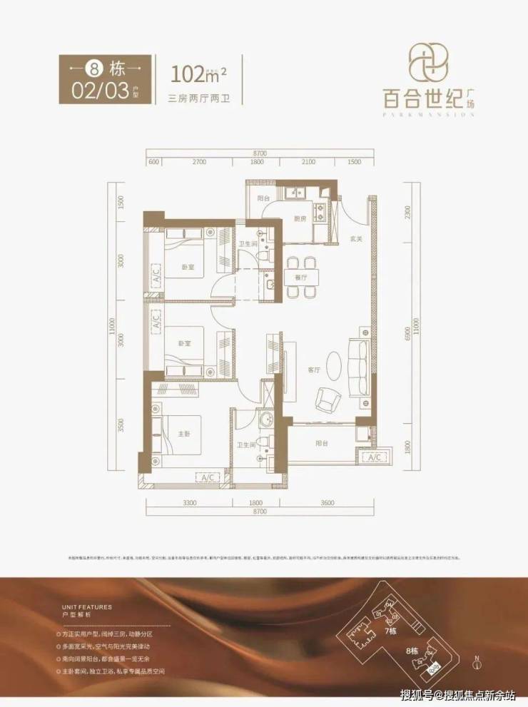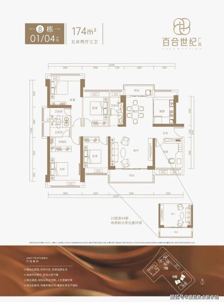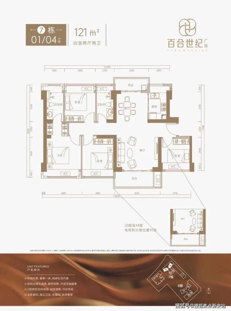 百合世纪广场(百合公园小镇)主推101㎡(7栋)、102㎡(8栋)、121㎡(7栋)、174㎡(8栋)户型。其中101-102㎡户型为传统竖厅布局,东南朝向,121-174㎡户型为客餐厅独立布局,带双阳台,南北通透。