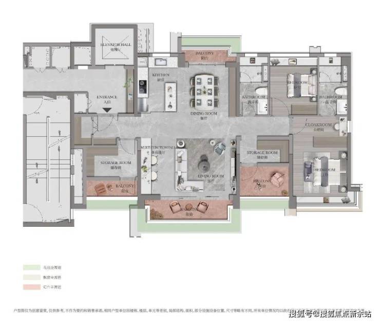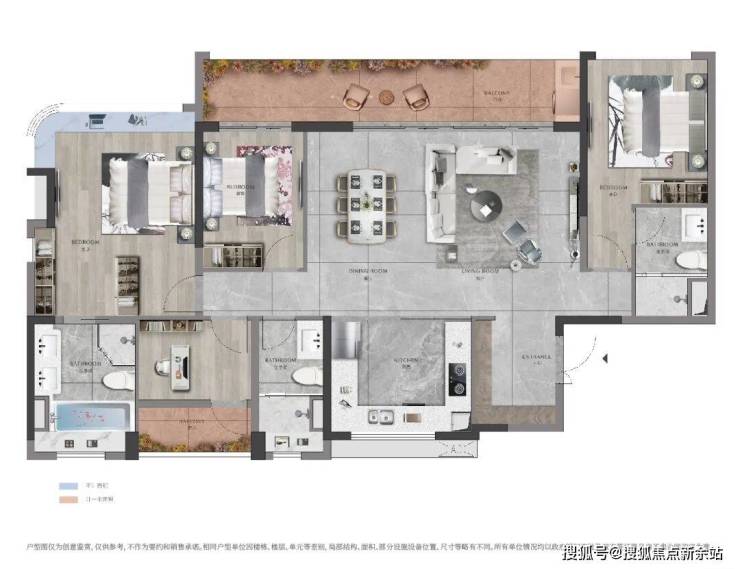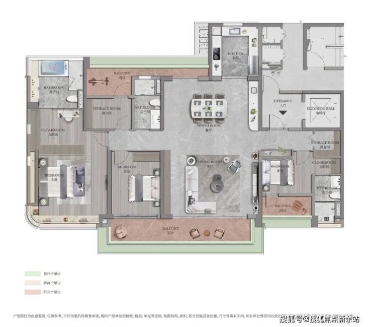 135㎡四房两厅两卫,约7m观景阳台,宽阔视野收藏中轴绿廊。