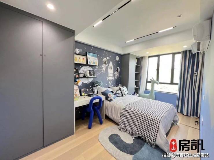 次卧儿童房的空间也完全足够,大面积窗户采光,门口还有一个小功能区,可改造成书房、衣帽间、电竞房等,整体居住体验舒适自然!