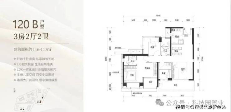 120㎡:客厅与卧室连通9.6㎡超大阳台,主卧带5.2㎡衣帽间,还有观景小阳台,主要为东南和西南朝向