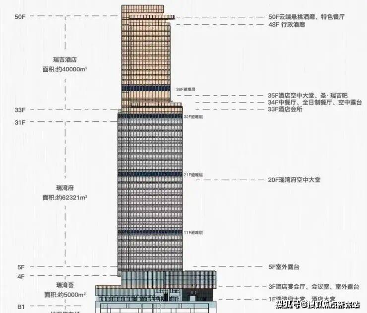 (5-19层底区,20-31层中区,33-51层瑞吉酒店)