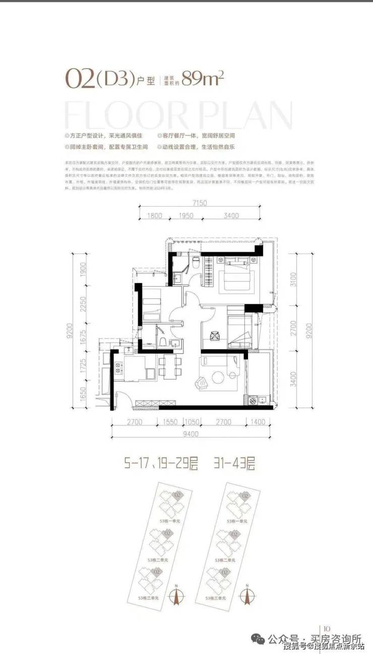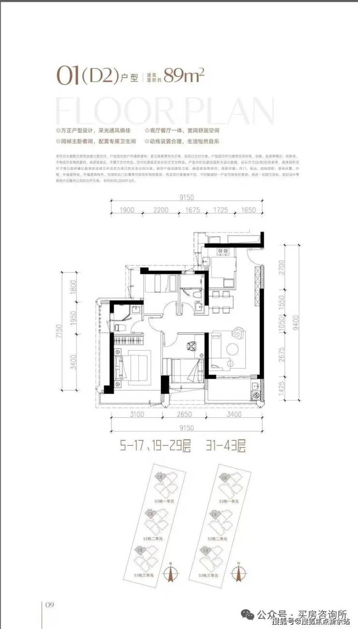 其中53栋3单元5-29层为三梯五户,都是89平三房。31-43层为三梯四户,其中3户为89平三房,1户为190平四房。这一栋也是小户型当中最好的一栋,89的01以及29楼以下得0405户型以及190㎡高楼层是可以看到海景的