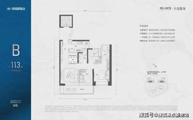 113㎡的3房2厅2卫,设计的是竖厅格局,电梯入户送独立公区,LDKB一体化设计,动静分区,三开间朝南,客厅连接次卧出超大观景阳台,主卧大套间设计,二字型厨房带1个小生活阳台,卫生间干湿分离,西南朝向。