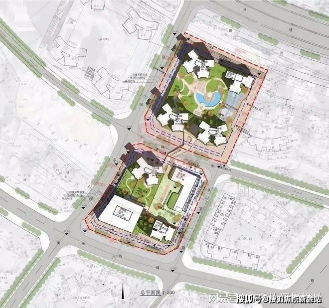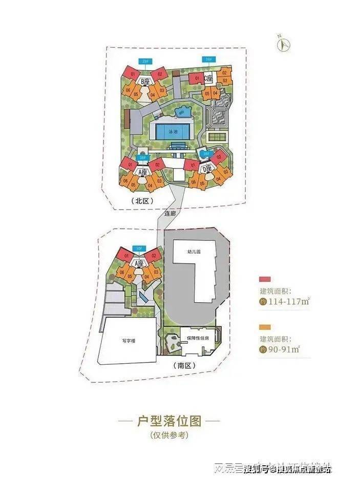 项目分为南北两区,规划有4栋38-39层高层住宅、1栋28层办公写字楼、1栋41层保障房,以及1座12班幼儿园,南北区通过廊桥相连。建筑采用大围合式布局,营造出开阔的中央水景空间,泳池位于中心位置,整体风格为国际流行的现代简约风,实现人车分流、商住分离。