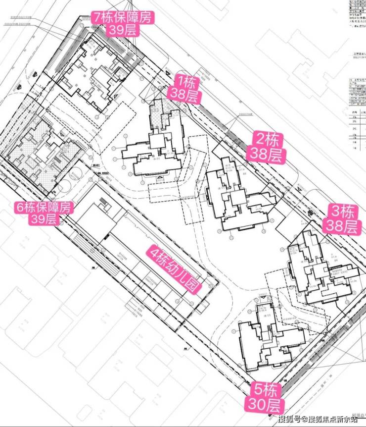 项目规划由6栋住宅及1栋幼儿园组成,总户数为1675户,其中1、2、3、5栋为总高30-38层高纯商品房住宅,共775户,4栋为3层高幼儿园,6、7栋为39层的保障性住房,共900户。