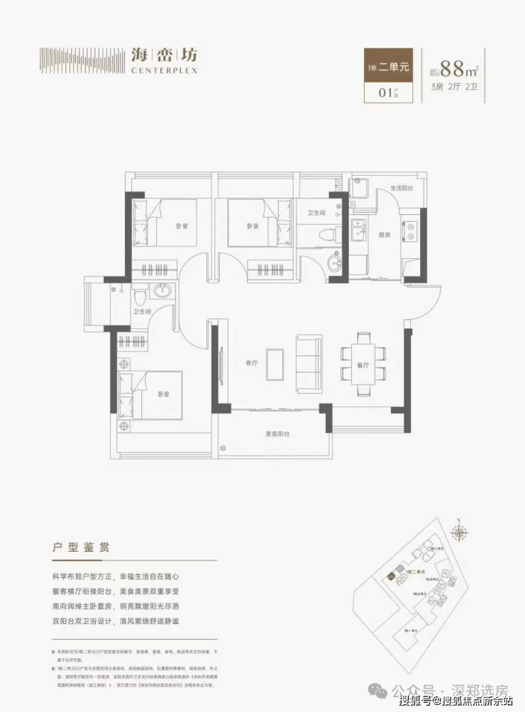 88㎡的3房厅2卫(1栋5单元01户型),设计的是竖厅南北通透格局,LDKB一体化设计,动静分区,四开间朝南,L型厨房,得房率:71.1%(不含赠送),阳台西北朝向。