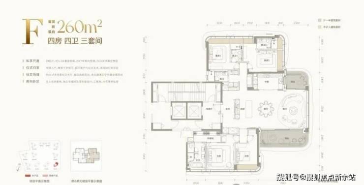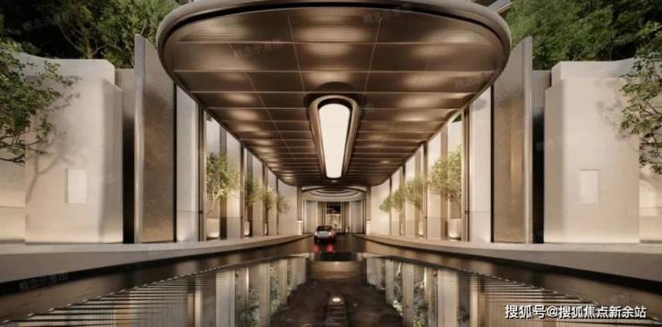 项目采用立体浮岛底盘设计,底部3层架空抬高,裙房布置万象系商业及社区配套,规划「地下落客-首层迎宾-上层漫游」三重立体归家礼序,约9米挑高车马厅搭配圆穹吊顶。