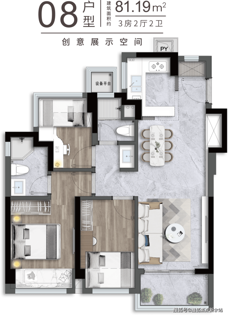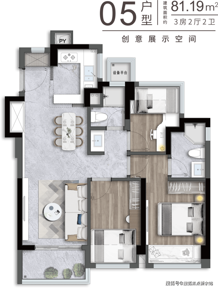 :81㎡左右户型,奢阔空间,满足成长型家庭需求,高使用率 + 智能精装,颜值与实用兼备