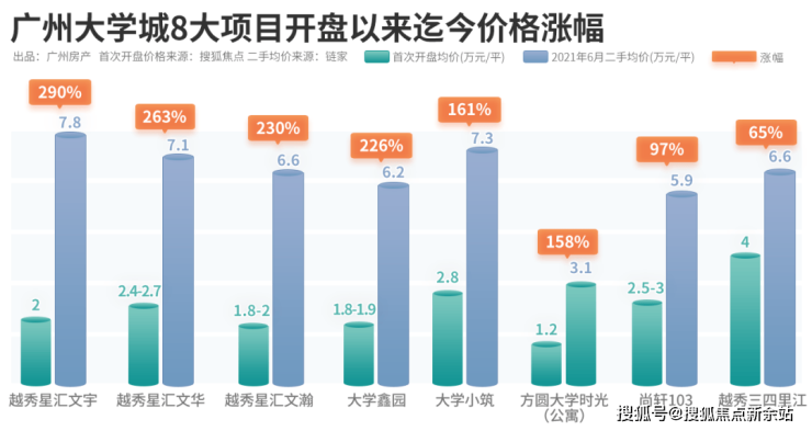 同样是越秀打造的越秀星汇文宇、越秀星汇文华、越秀星汇文瀚三个住宅项目,作为大学物业的领头羊,十年时间房价增幅超过了230%。
