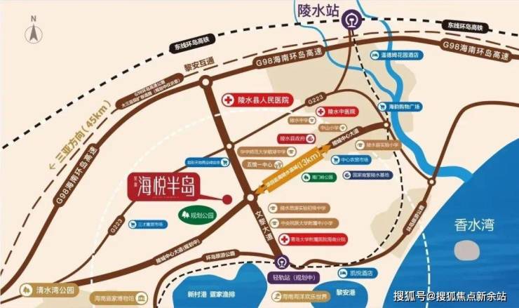 昊瑞·海悦半岛项目位于海南陵水文黎大道与中心大道交汇处,距G98环岛高速黎安互通约5公里,距陵水动车站约7.7公里,距离三亚凤凰机场约71公里。从项目出发,开车约1小时到三亚市区,约2个半小时到海口市区;陵水站乘动车22分钟抵达三亚市区,75分钟可到海口市区,项目路网发达,海陆空畅连全岛、全国。