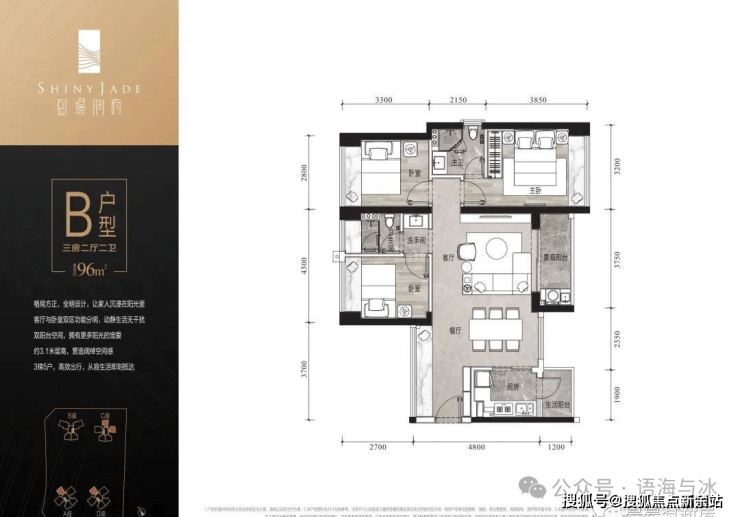 建面约96㎡三房两厅两卫双阳台