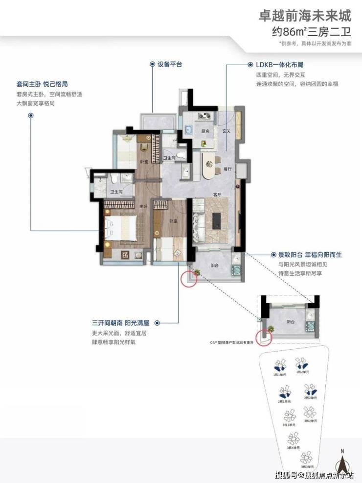 南向采光:约86㎡三房两卫实现三开间朝南,约113㎡四房两卫实现五开间朝南,全明通透