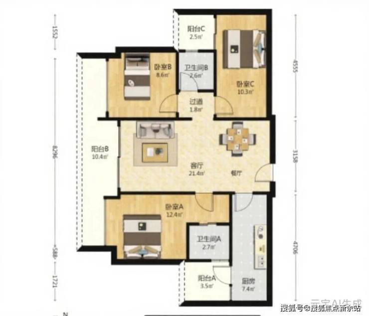 ◆本户型为规整的南北通透结构,面宽较大,利于采光通风。核心优势在于:1. 功能分区明确,实现了真正的“三室分离”,卧室A/B/C分列户型两端,与客厅、餐厅、厨房等动区完全隔离,静区私密性极佳,互不干扰。2. 公共区域开阔大气,客厅与餐厅形成总面积约21.4㎡的宽敞横厅,再衔接10.4㎡的阳台B,进一步放大了空间感,公共活动体验卓越。3. 主卧(卧室A)尺度奢华,面积达12.4㎡并配有独立卫生间(卫生间B),且紧邻阳台A/B。