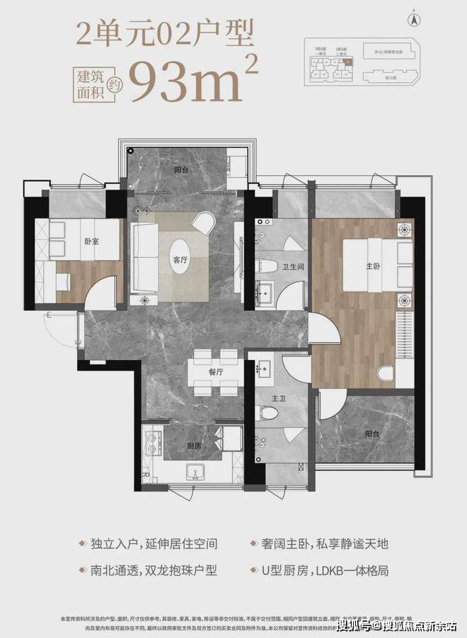 1栋1单元02户型/1栋2单元01户型,竖厅南北通透格局,独立入户,客厅3.2米开间,LDKB一体化设计,动静分区,南北双阳台,U型厨房,卫生间干湿分离,阳台正北朝向。