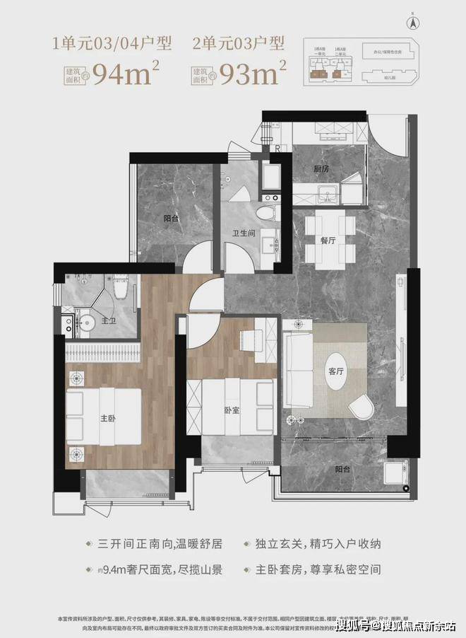 【建筑面积93/94㎡3房2卫】