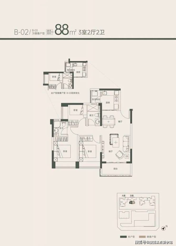南北通透四房户型,是「京地海樾府」最大的户型,主阳台朝西北,生活阳台朝东南。同样位于1B座的2梯4户结构,这个户型只有58套,适合改善需求和周