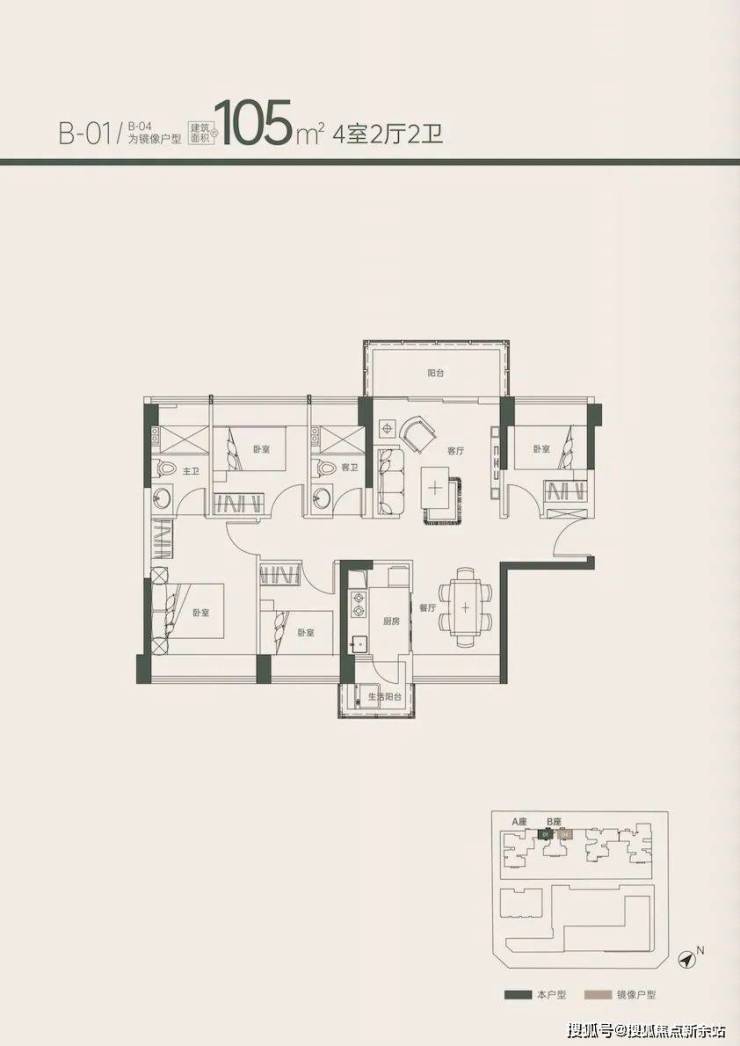 位于1B座是两梯四户的格局,尺度感不亚于目前市面上95㎡的产品。