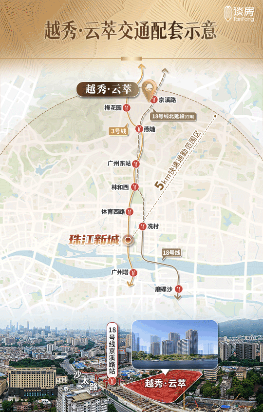 地铁:紧邻 18 号线京溪路站,未来或通过地下通道直连站厅,1 站到广州东站,2 站到珠江新城。另外距离项目约1公里,还有3号线梅花园站,1站换乘6号线,2站到珠江新城。