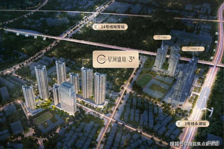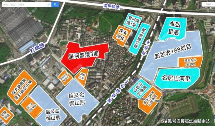 星河盛境3期,位于龙岗区横岗园山街道安红路与永湖路交汇处,项目前身为“龙岗区园山街道保安窝肚村城市更新单元”,南侧是信义金御山居(在建),西北侧约200米是信义玻璃厂,3号地铁线“永湖站”距离约400米。