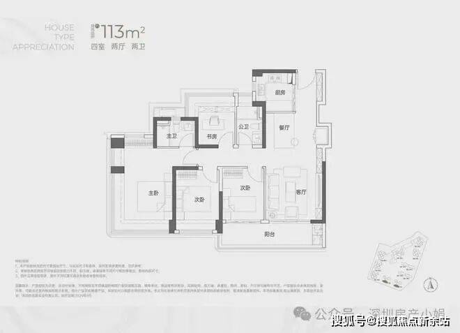 建面约115㎡ 四房两卫• 格局:横厅设计,三种户型贴合不同朝向,南北通透无遮挡,赠送率居首。• 亮点:餐客厅一体化,30㎡阔绰公共空间,搭配超大景观阳台;四开间朝南,全屋采光均匀,主卧套房设计,私密度拉满。