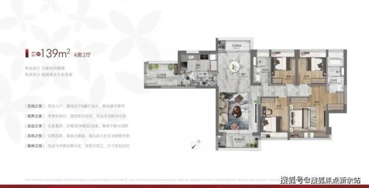 建面139平四房两卫,独立入户花园,大客厅,南北对流双阳台设计,主卧套房带衣帽间