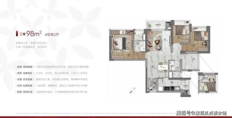 建面98平四房两卫,全屋智能化铺设,大主卧设计,双阳台