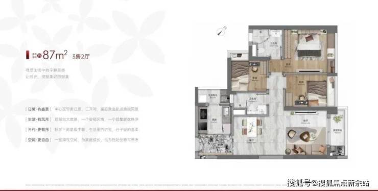 建面87-89平三房两卫,带主套设计,89平四开间朝南,三个房间带有大飘窗