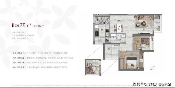 建面76-78平三房一卫,三开间望江,私密入户玄关,带生活阳台,主卧次卧都可望江